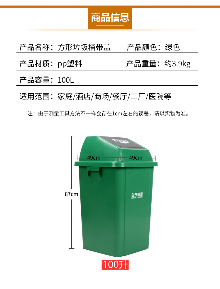 白云清洁 方形带盖垃圾桶 AF07313 绿色 100L 1个
