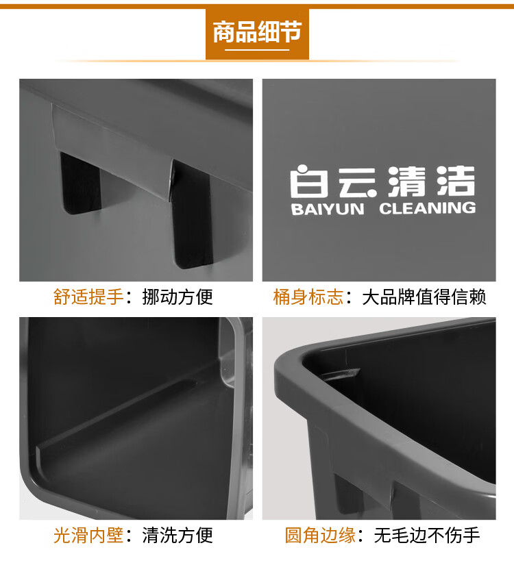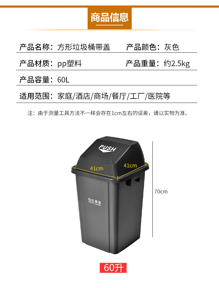 白云清洁 方形带盖垃圾桶 AF07312 灰色 60L 1个