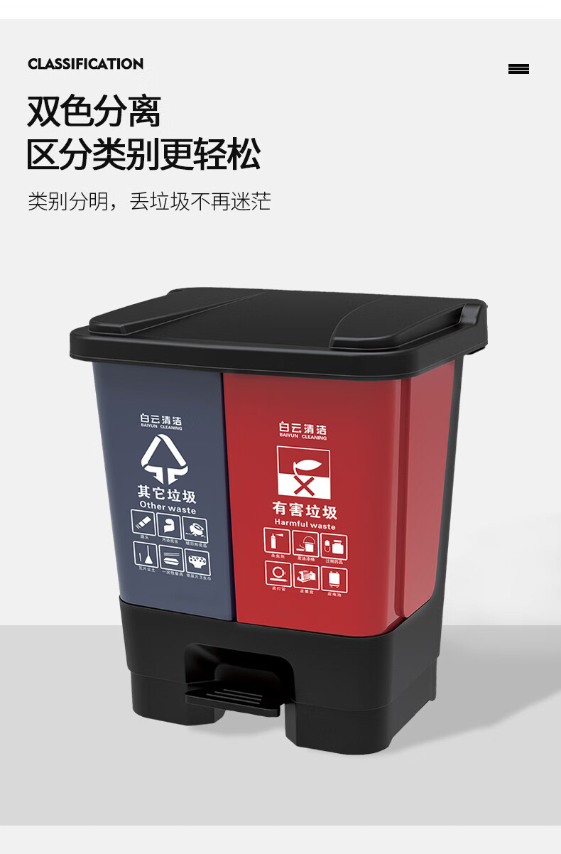 白云清洁 脚踏分类垃圾桶 AF07337 灰红 40L 1个