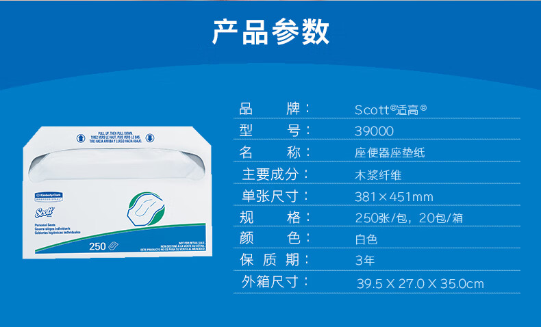 适高(Scott)金佰利座便器座垫纸酒店商场洗手间商用抽取式盒装坐垫纸381*451mm/张 250张/包 20包/箱 39000