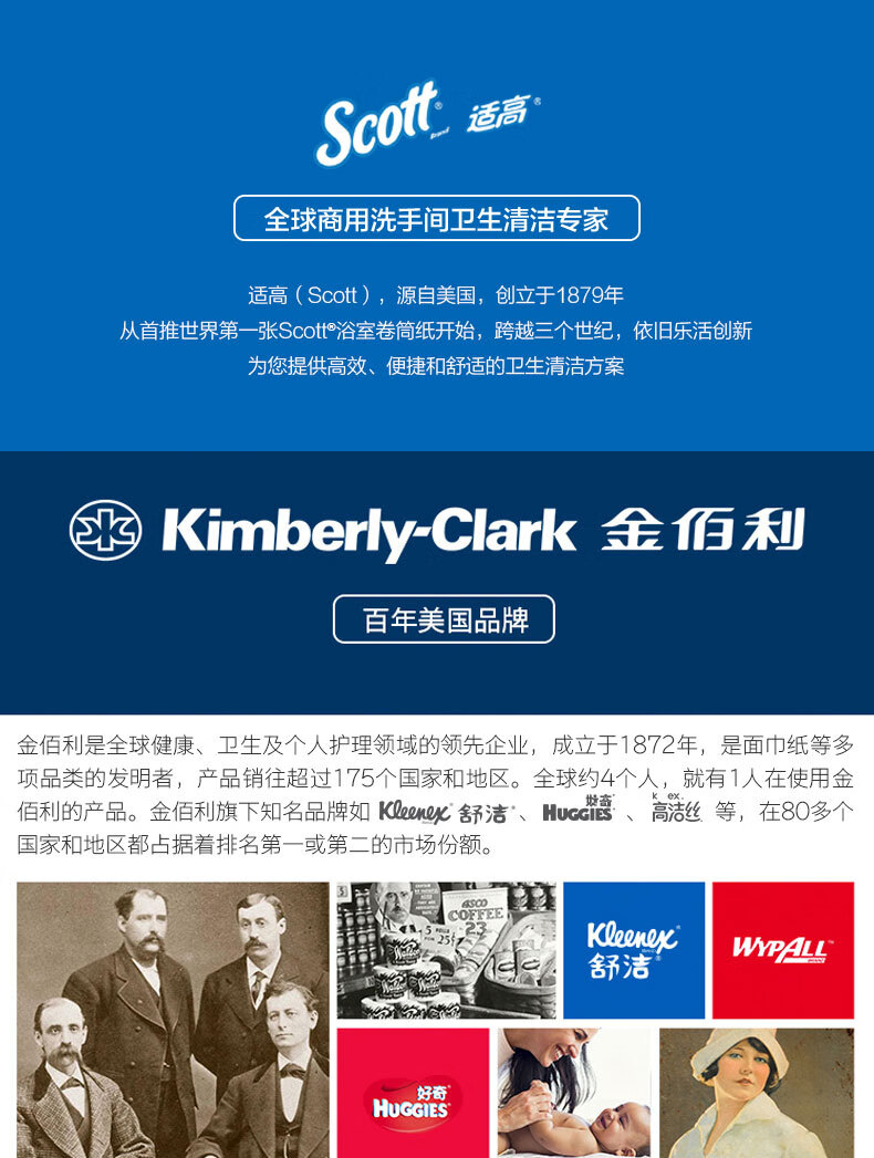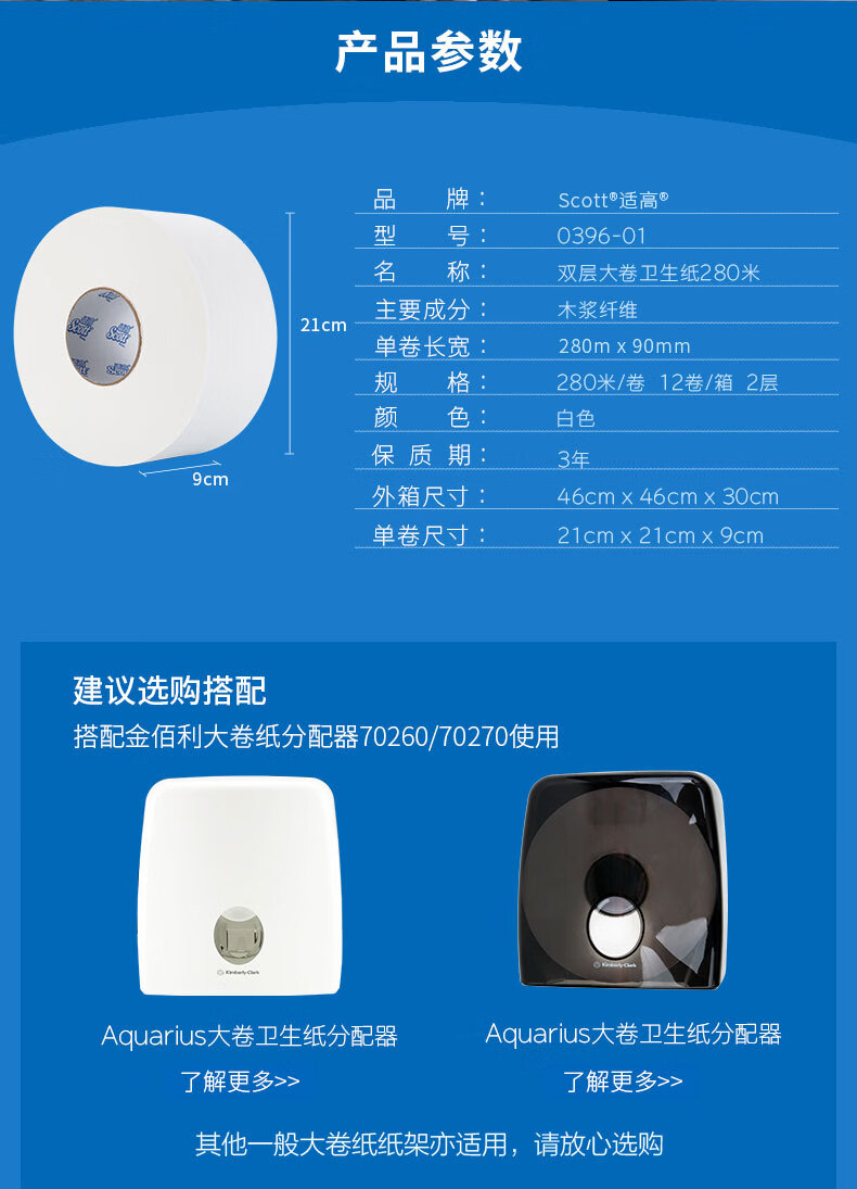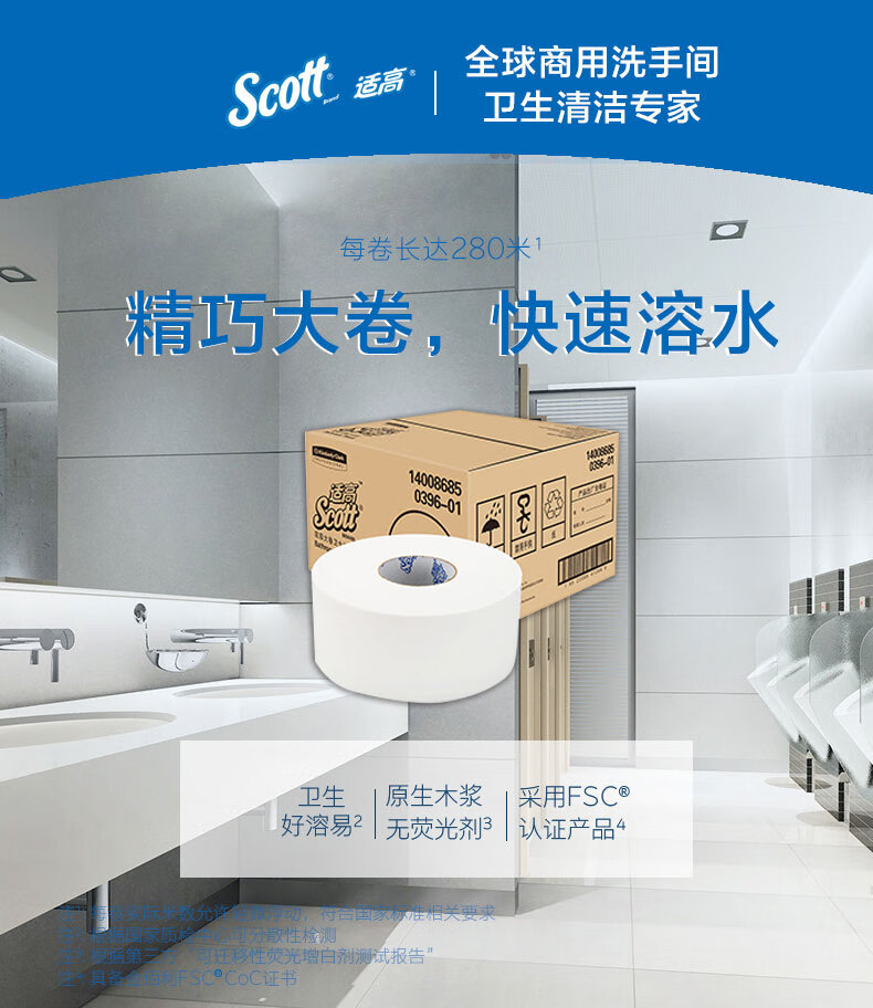 适高(Scott)金佰利双层大卷卫生纸洗手间商用擦手纸140mm割线*90mm 280米/卷 12卷/箱 0396-01