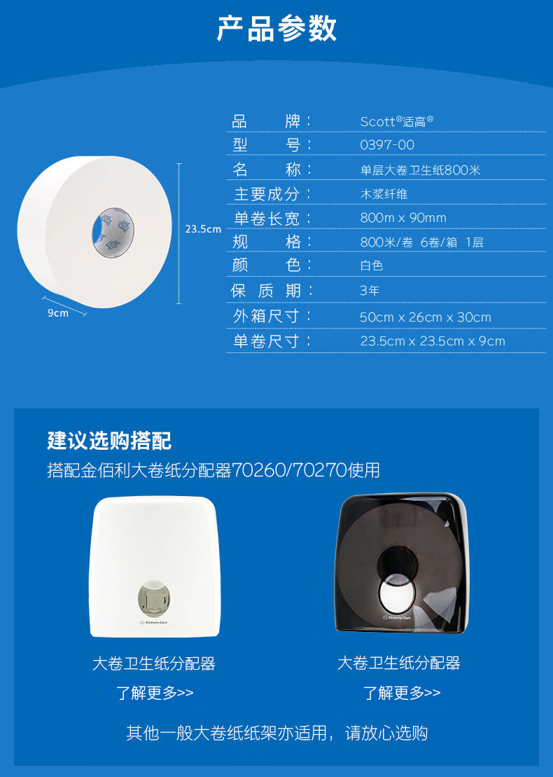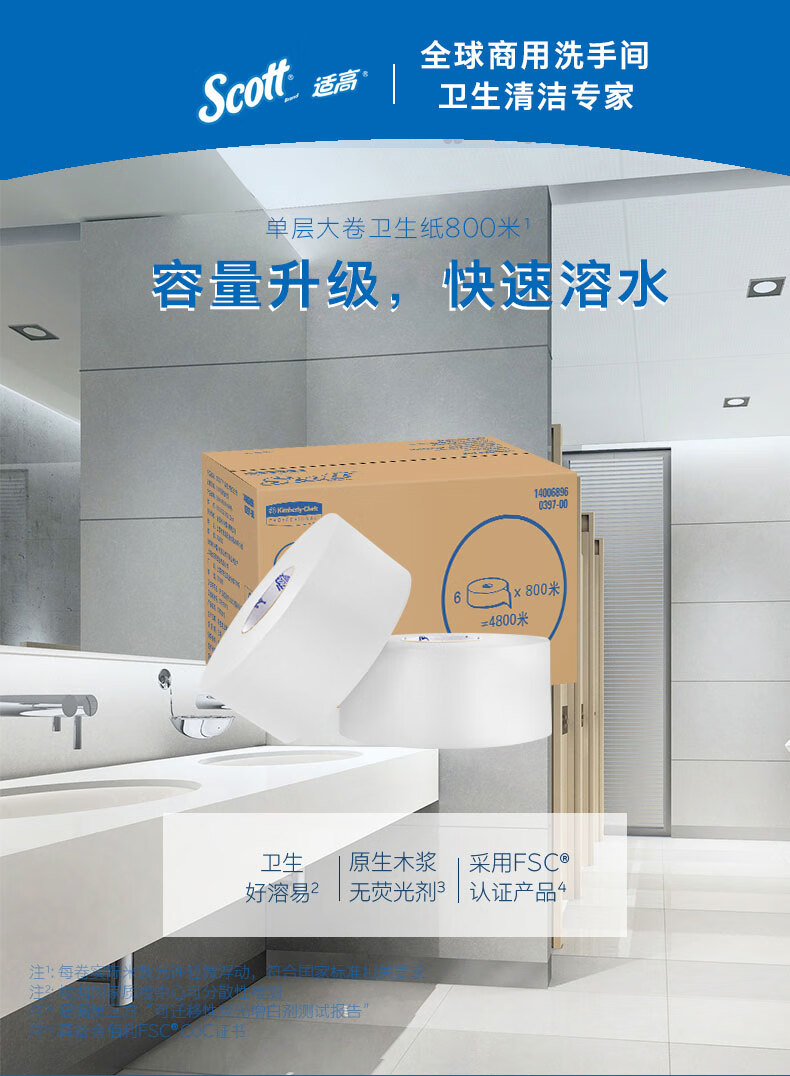 适高(Scott)金佰利单层大卷卫生纸商用洗手间专用擦手纸 800米/卷 x 6卷 0397-00
