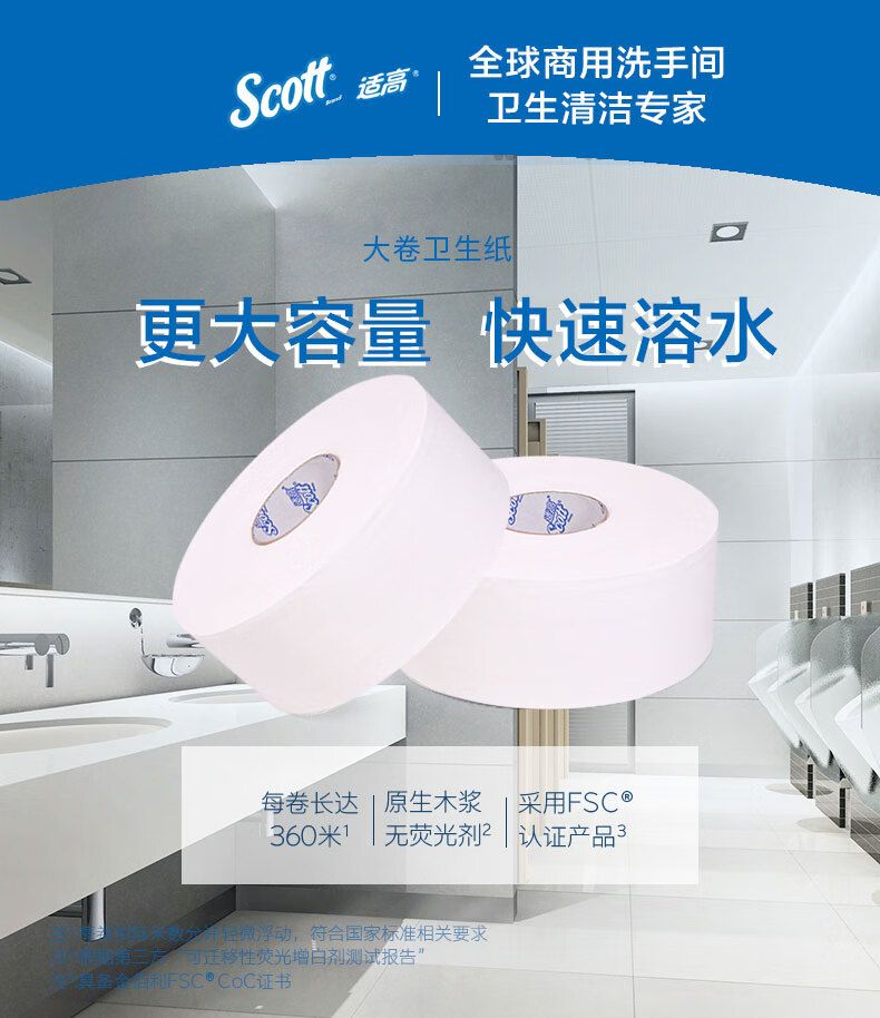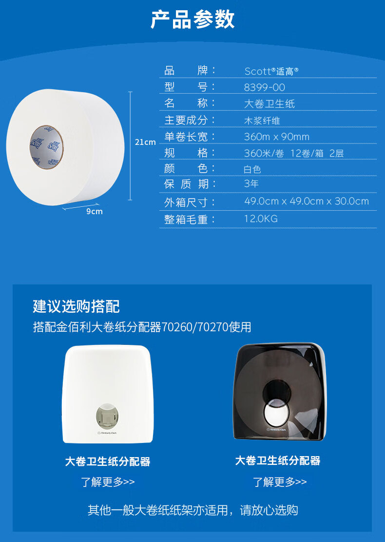 适高(Scott)金佰利双层大卷卫生纸酒店洗手间商用卫生纸 360米/卷 12卷/箱 8399