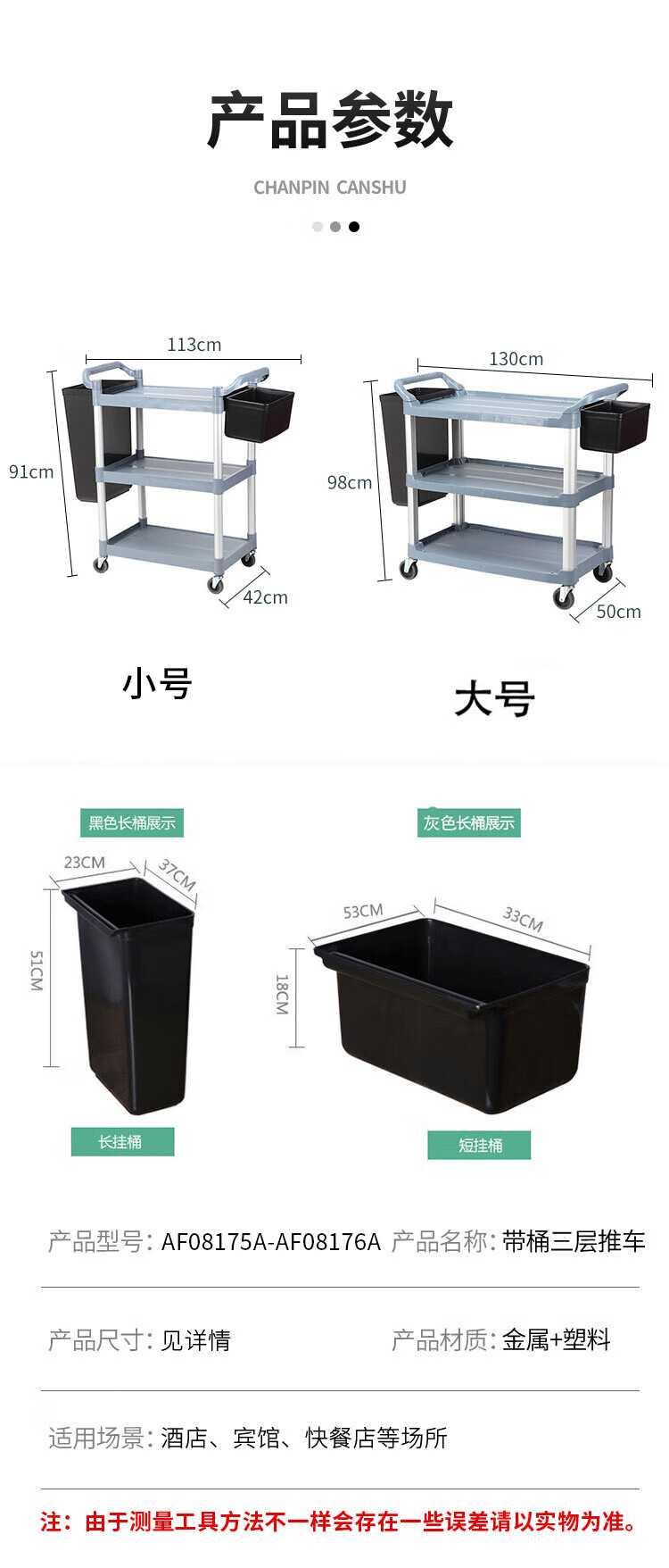 白云清洁 AF08175A 大号带桶三层推车清洁车塑料推车饭店手推车酒水车