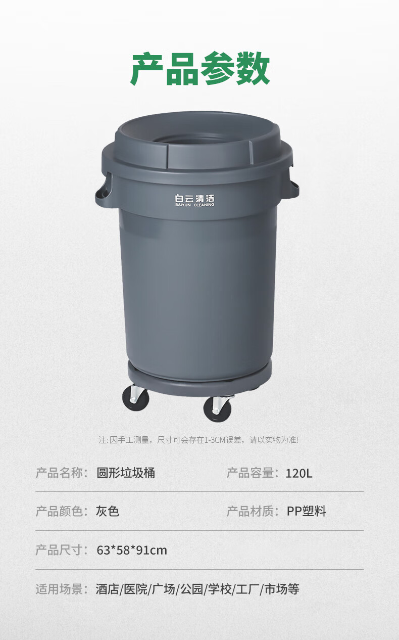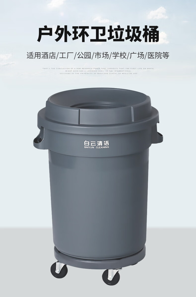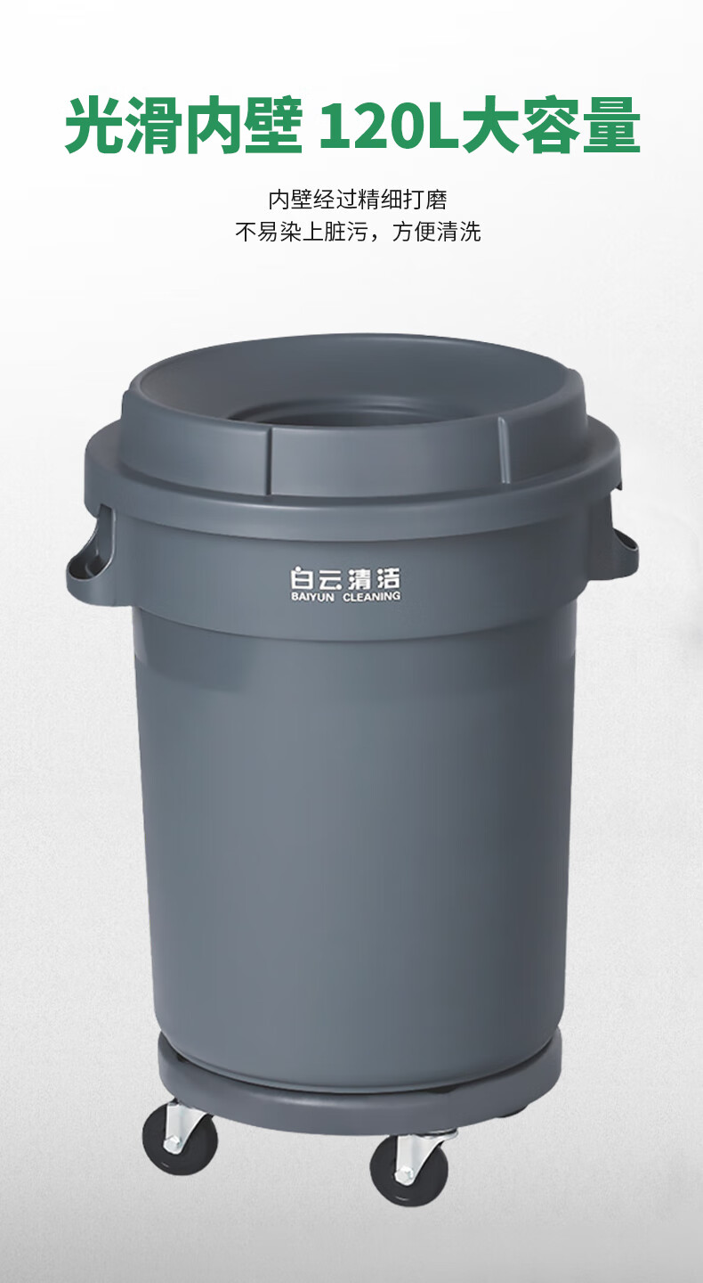 白云清洁 圆形垃圾桶 AF07504 灰色 带轮 120L 1个