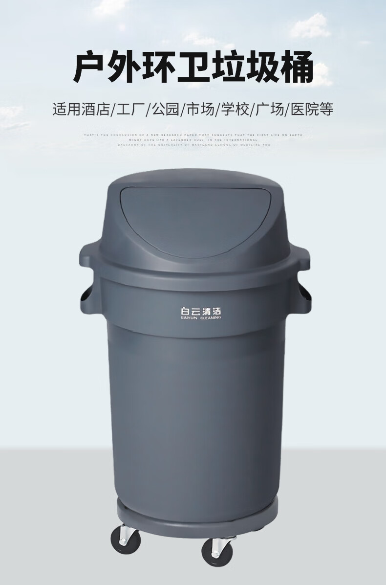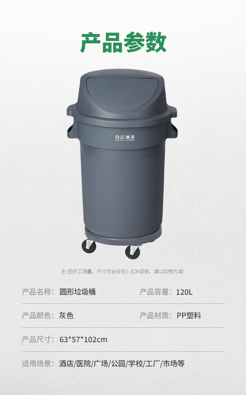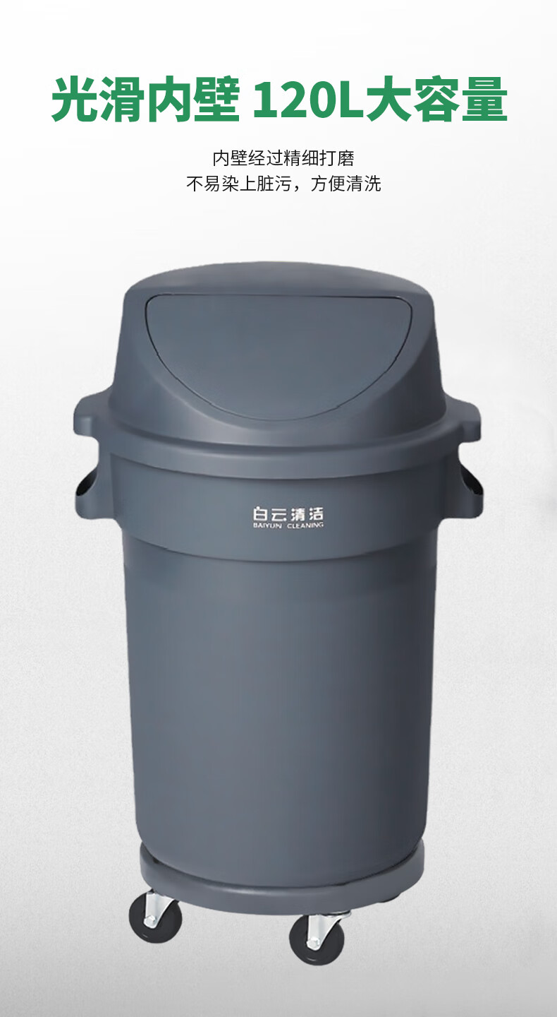 白云清洁 圆形垃圾桶 AF07506 灰色 带轮 120L 1个