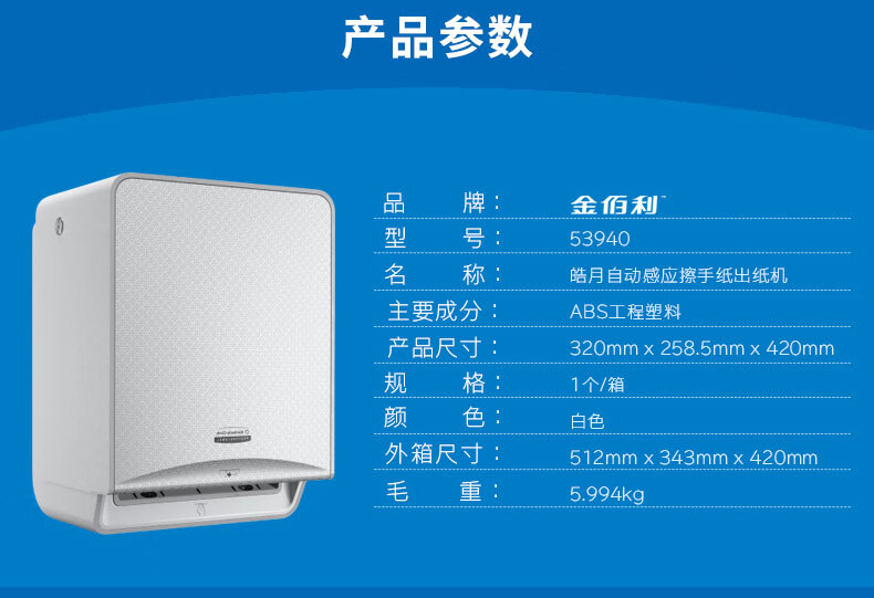 金佰利(Kimberly-Clark)卫生间自动感应擦手纸出纸机公共厕所智能擦手纸盒 白色 1个/箱 53940