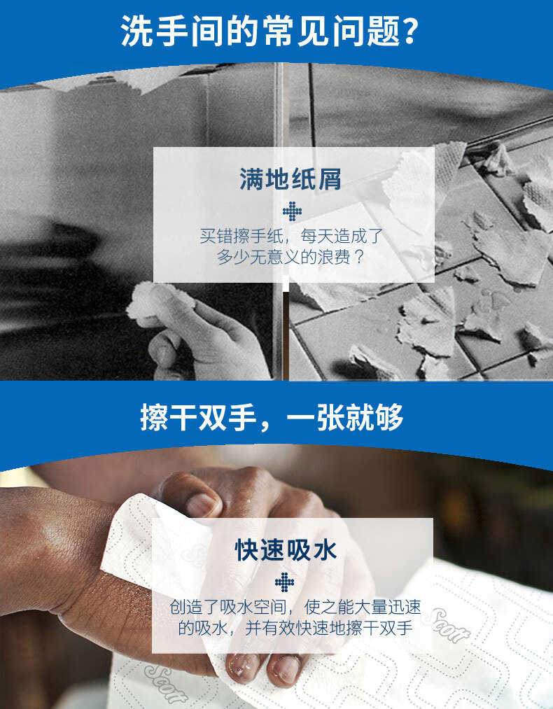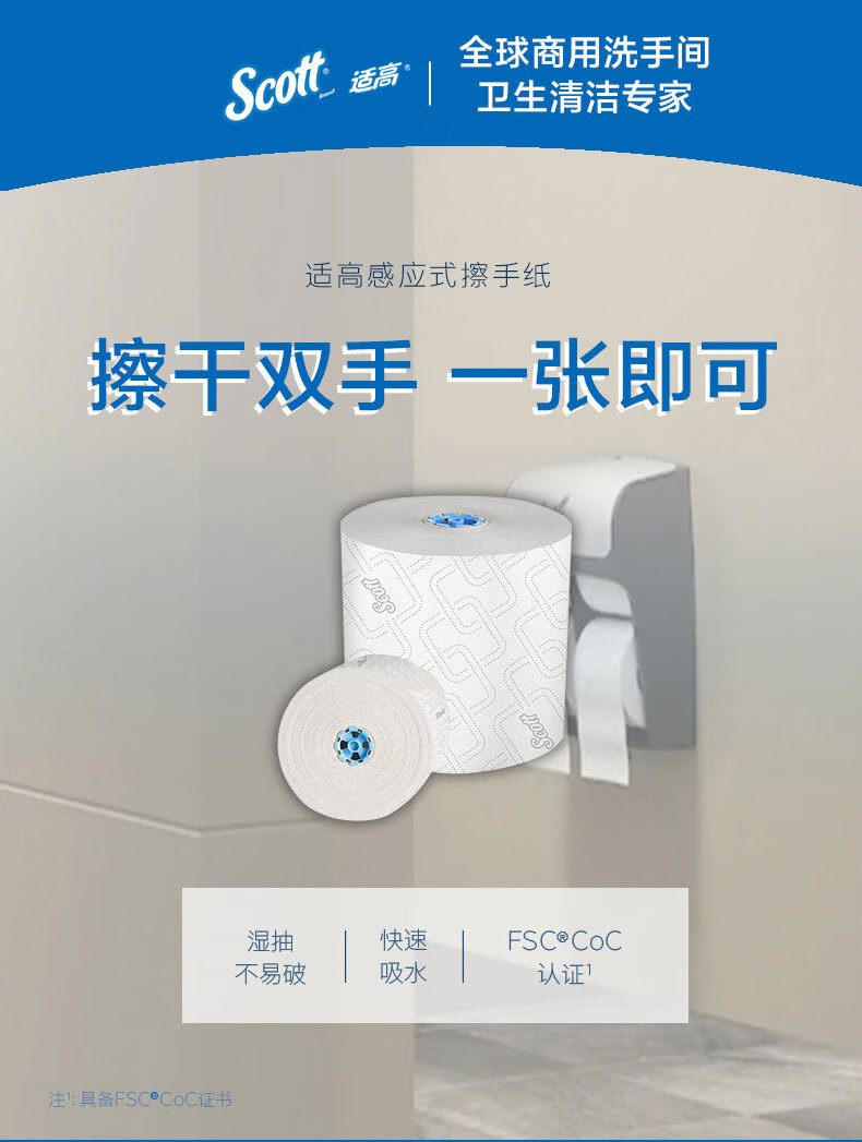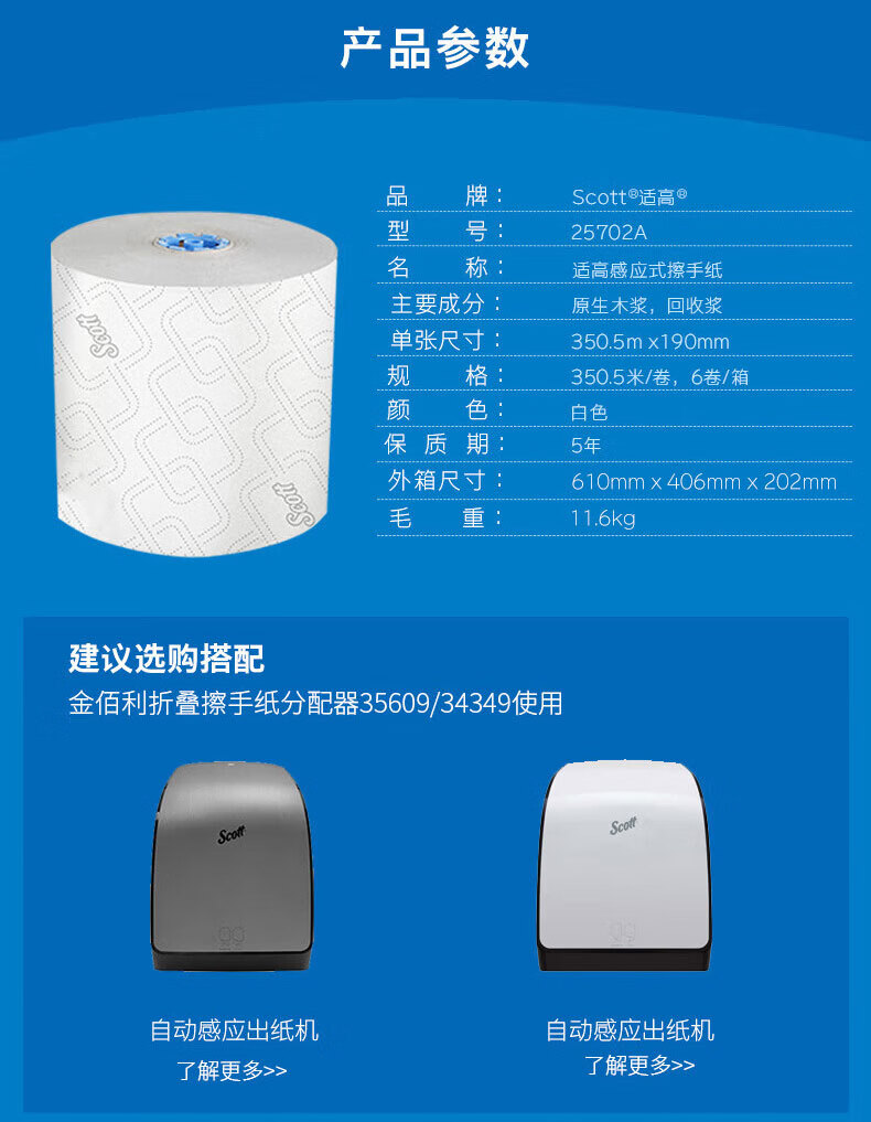 适高(Scott)金佰利感应式擦手纸工业洗手间商业用纸 350.5米/卷 6卷/箱 25702A