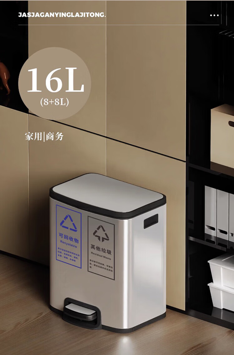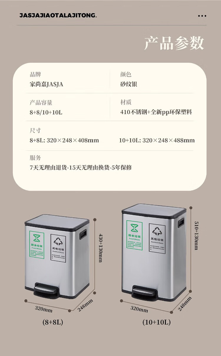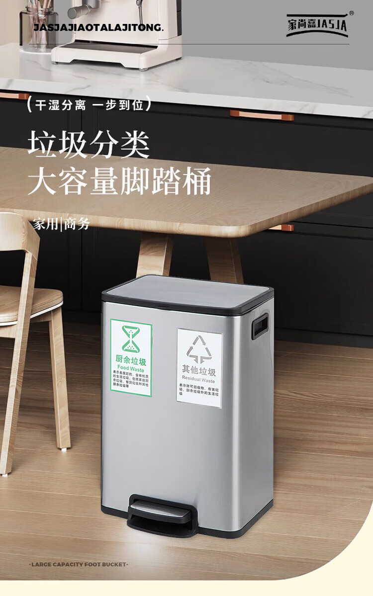 家尚嘉JASJA DF320B-10LX2 不锈钢脚踏双格垃圾桶 商场办公室卫生间厨房脚踩桶 特大号 银色20L