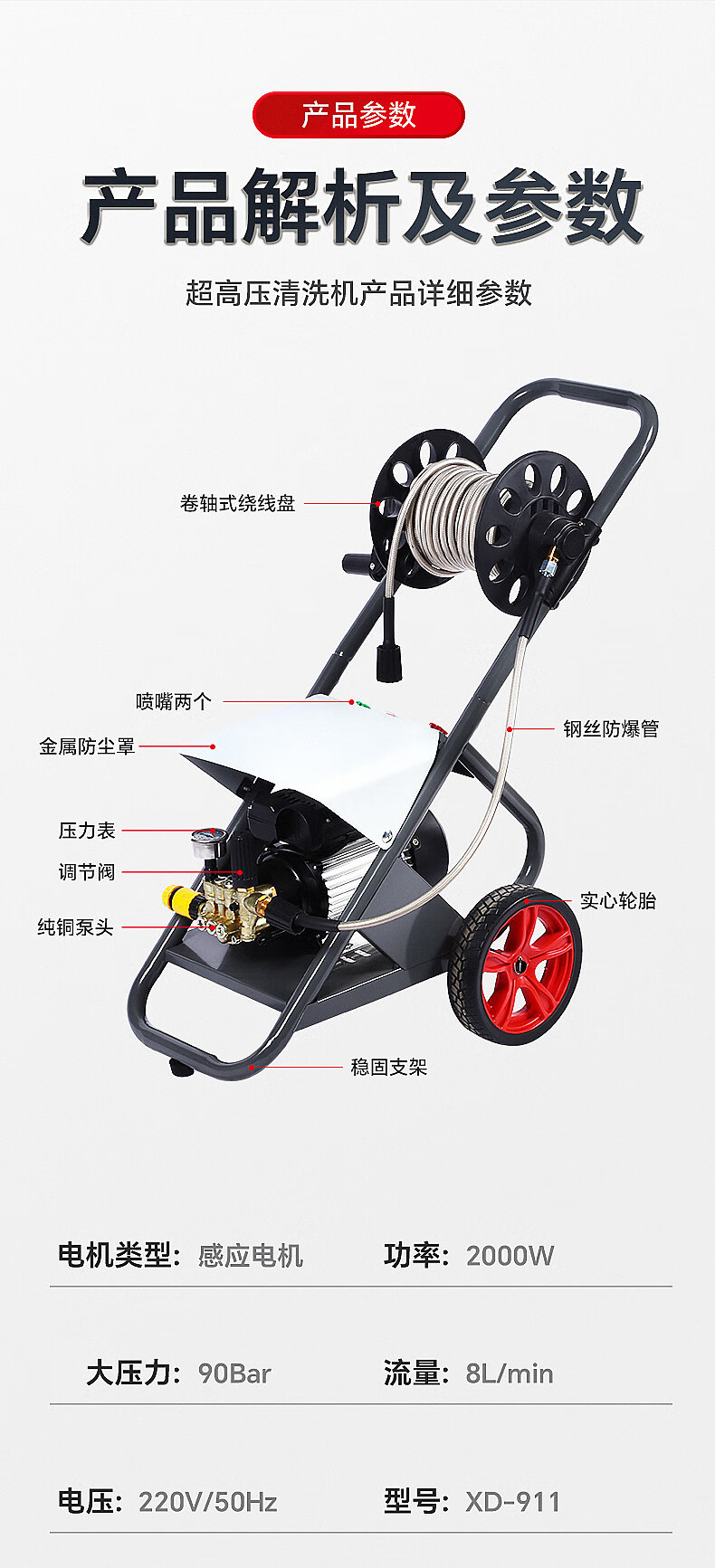 兴地 XD-911 高压洗车机220v商用大功率高压清洗机洗车店自动刷车 标配10米管