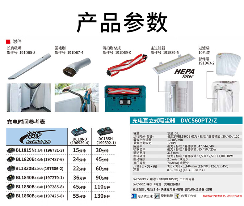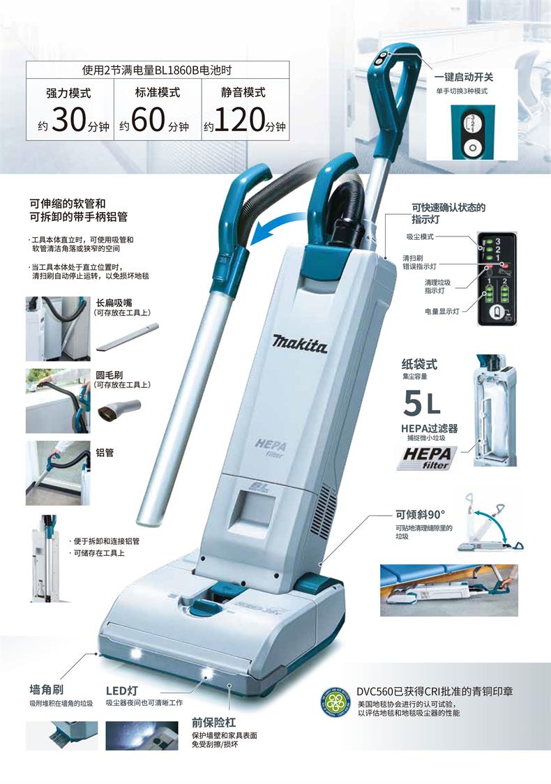 牧田(makita)DVC560PT2 手持立式大吸力无线充电式强力除尘机吸尘器 (5.0AH双电双充)