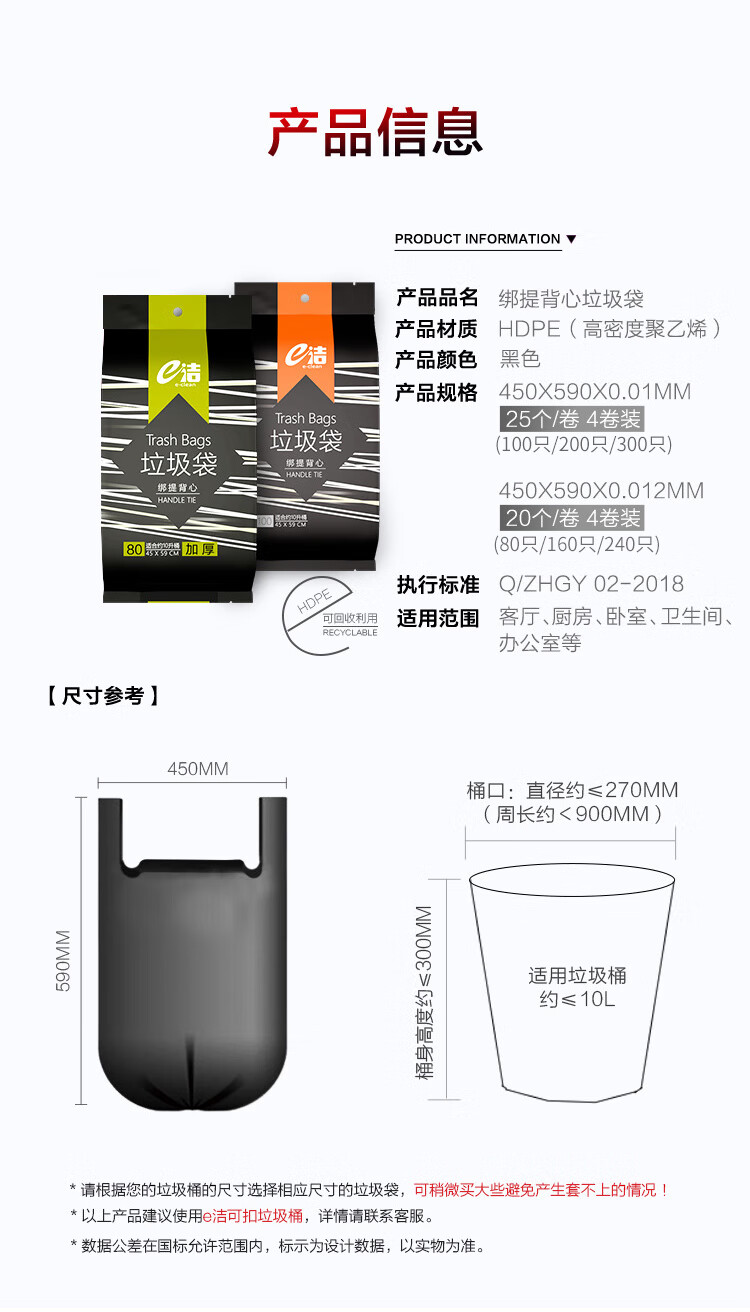 e洁 背心垃圾袋50*69cm手提式厨卫宿舍干湿分类塑料袋 加厚黑色1.1丝HT115069-75 共75只