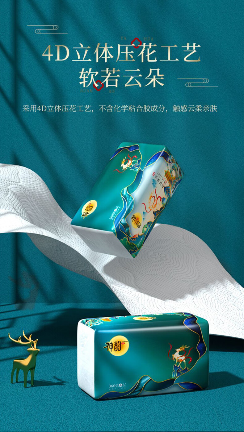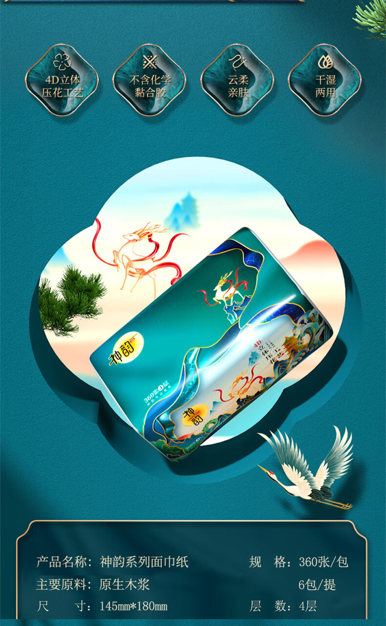 神韵 4976+4983 洗手间擦手纸加厚湿水不易破抽纸360张4D压花4层6连包面巾纸*6提(36包)