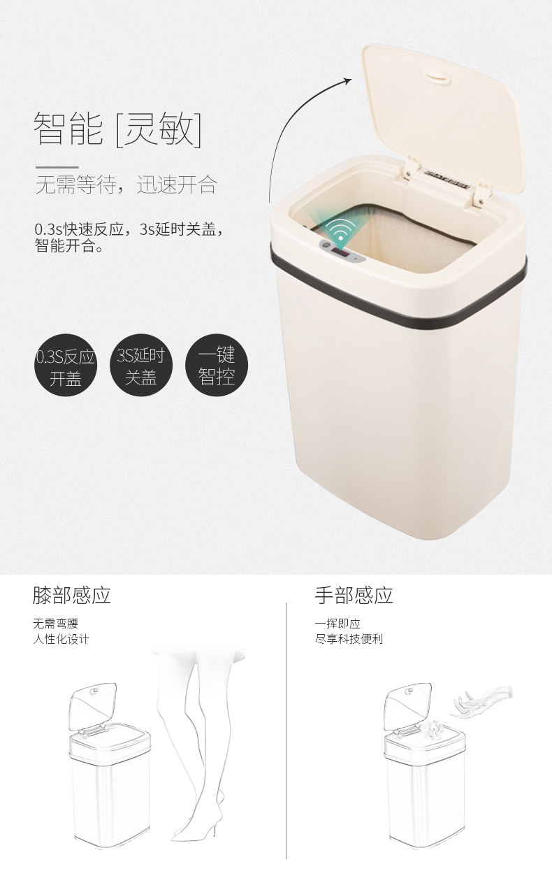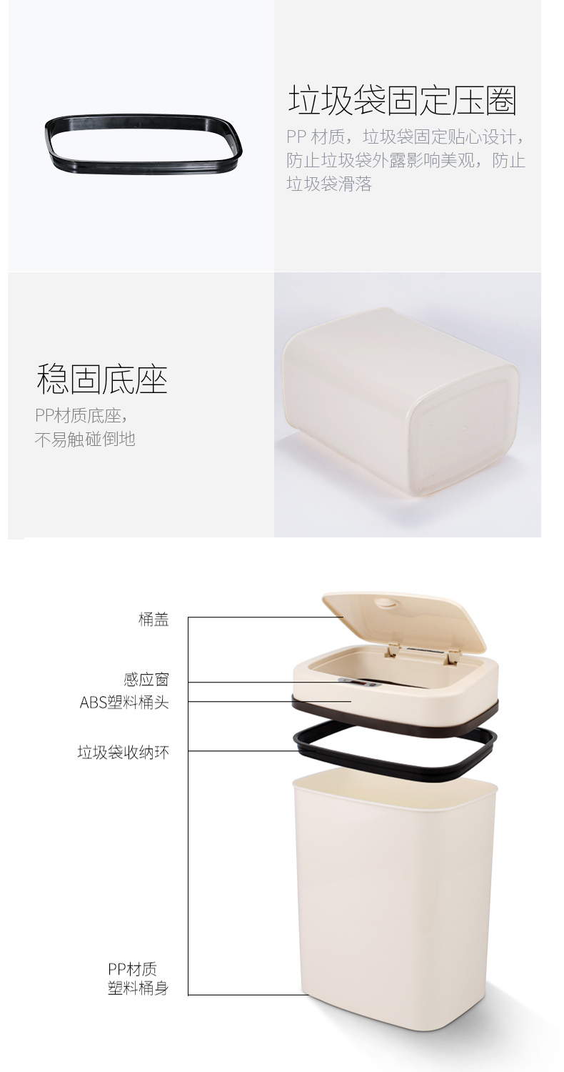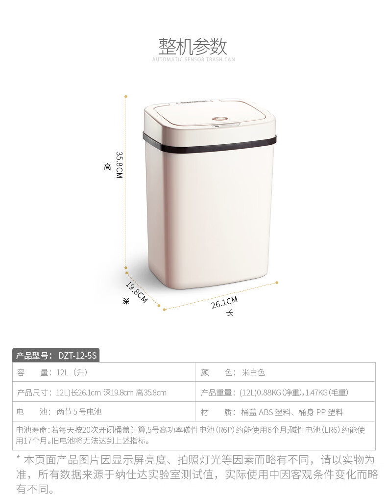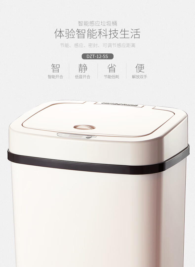 NST纳仕达DZT-12-5S 智能感应垃圾桶卧室客厅开盖大容量收纳桶 12L米白色+普通电池
