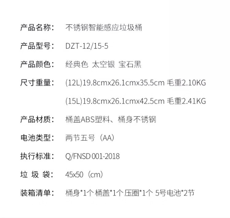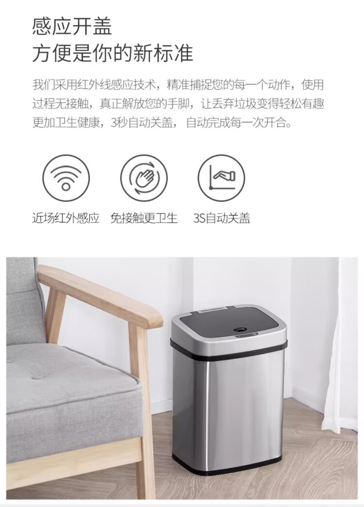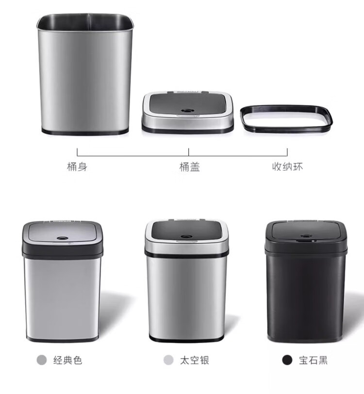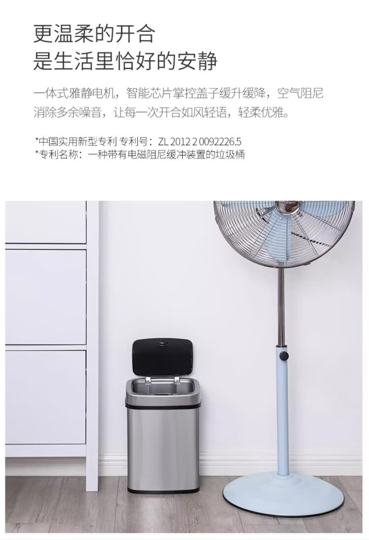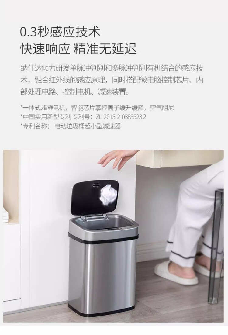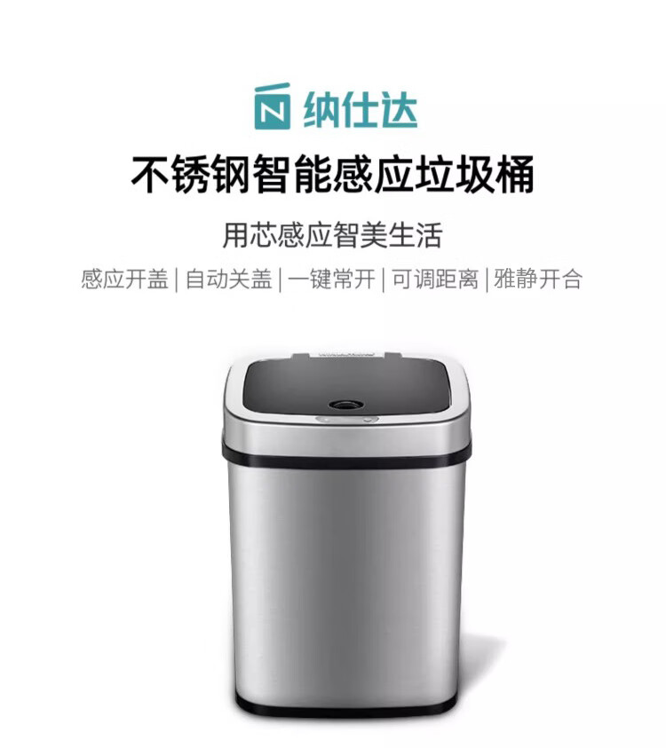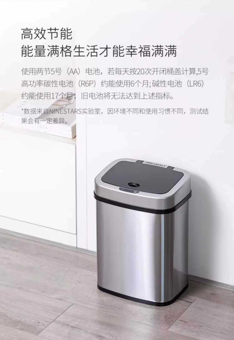 NINESTARS纳仕达 DZT-15-5 智能感应垃圾桶 防水级 全自动卫家办公室卧室客厅宿舍纸篓桶夹缝电池款 经典色 15L