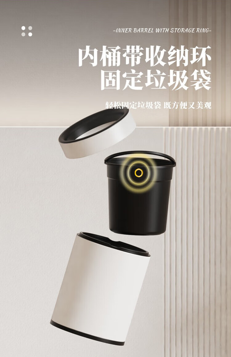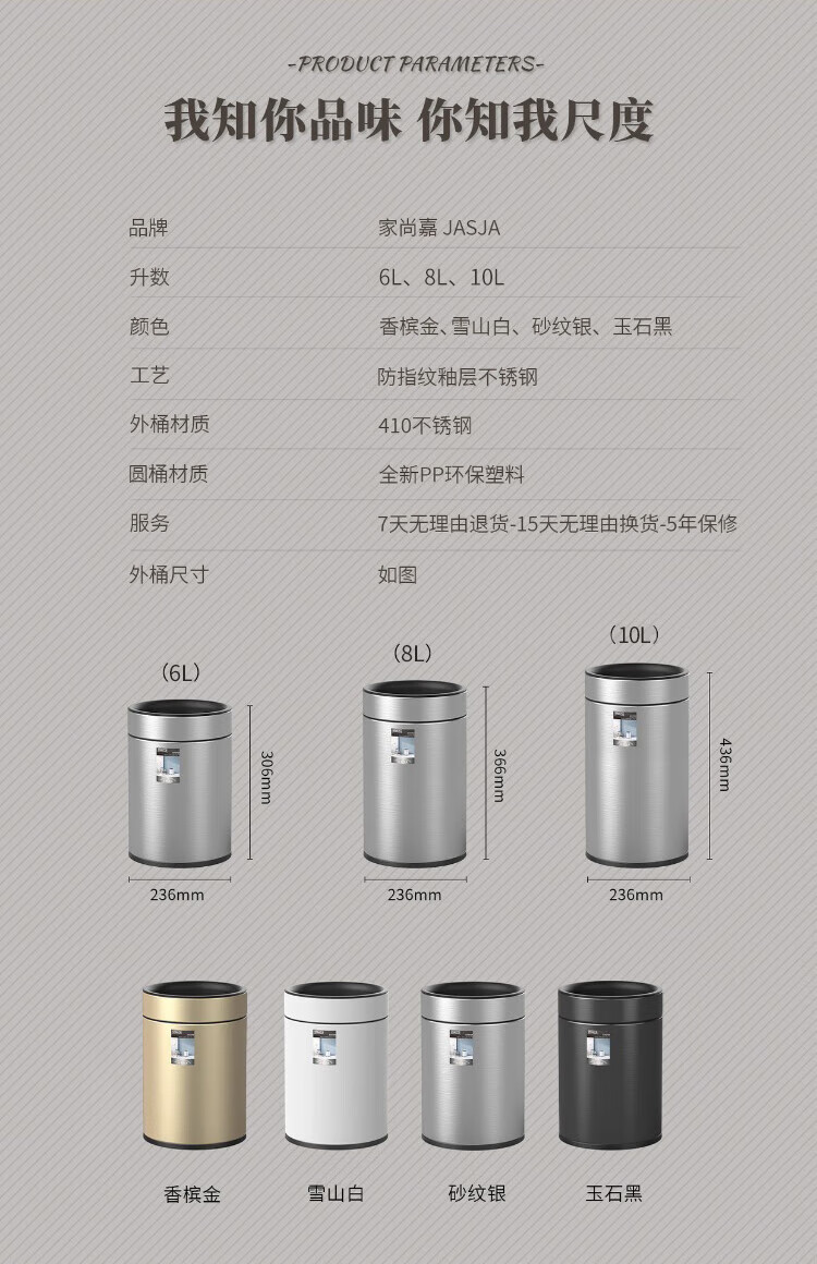 家尚嘉JASJA DK236-08 不锈钢垃圾桶 办公室酒店客厅卫生间双层桶 圆形 玉石黑 8L