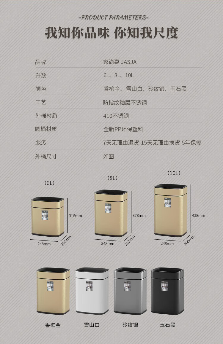家尚嘉JASJA DK248-06 不锈钢垃圾桶 办公室酒店客厅卫生间双层桶 方形 砂纹银 6L