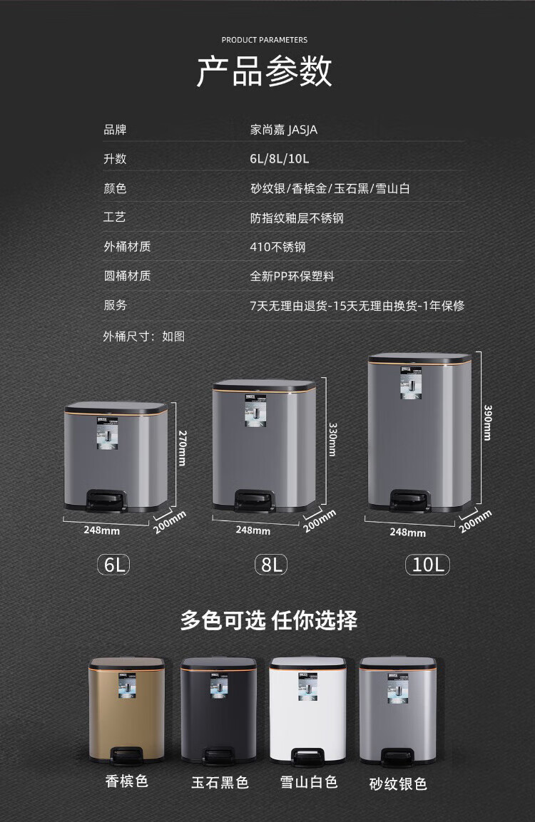 家尚嘉JASJA DF248-06 不锈钢脚踏垃圾桶 商用酒店办公室客厅带盖双层桶 方形 白色 6L