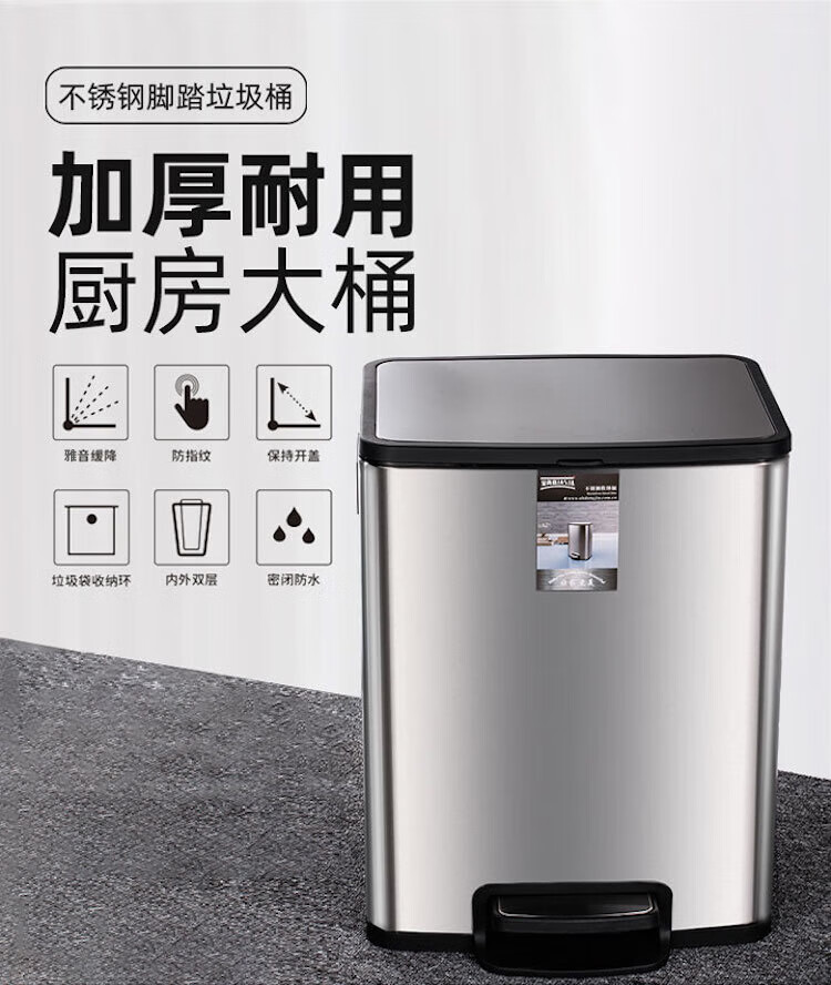 家尚嘉JASJA DF320A-12L 不锈钢脚踏垃圾桶 大容量客厅办公室加厚双层桶 方形 香槟金12L