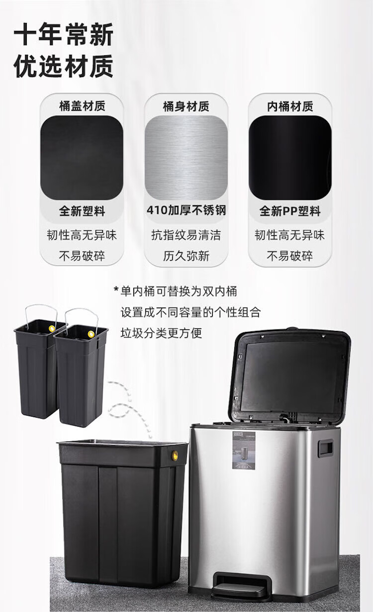 家尚嘉JASJA DF320A-12L 不锈钢脚踏垃圾桶 大容量客厅办公室加厚双层桶 方形 银色12L