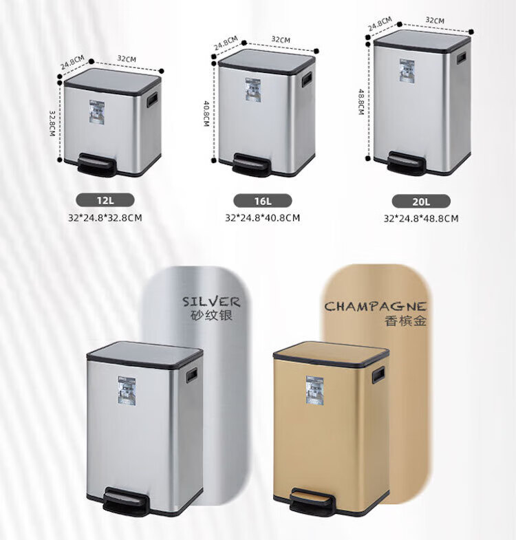 家尚嘉JASJA DF320A-16L 不锈钢脚踏垃圾桶 大容量客厅办公室加厚双层桶 方形 香槟金16L