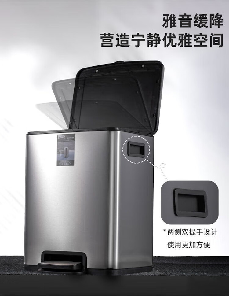家尚嘉JASJA DF320A-20L 不锈钢脚踏垃圾桶 大容量客厅办公室加厚双层桶 方形 银色20L