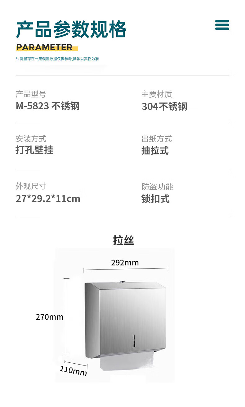 莫顿 擦手纸盒 拉丝 304不锈钢 M-5823