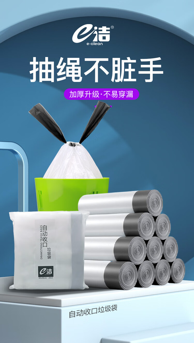 e洁 抽绳垃圾袋 45*50cm自动收口驱蚊防臭宿舍办公厨卫可降解塑料袋 加厚 白色 JDT104550-20-3 共60只