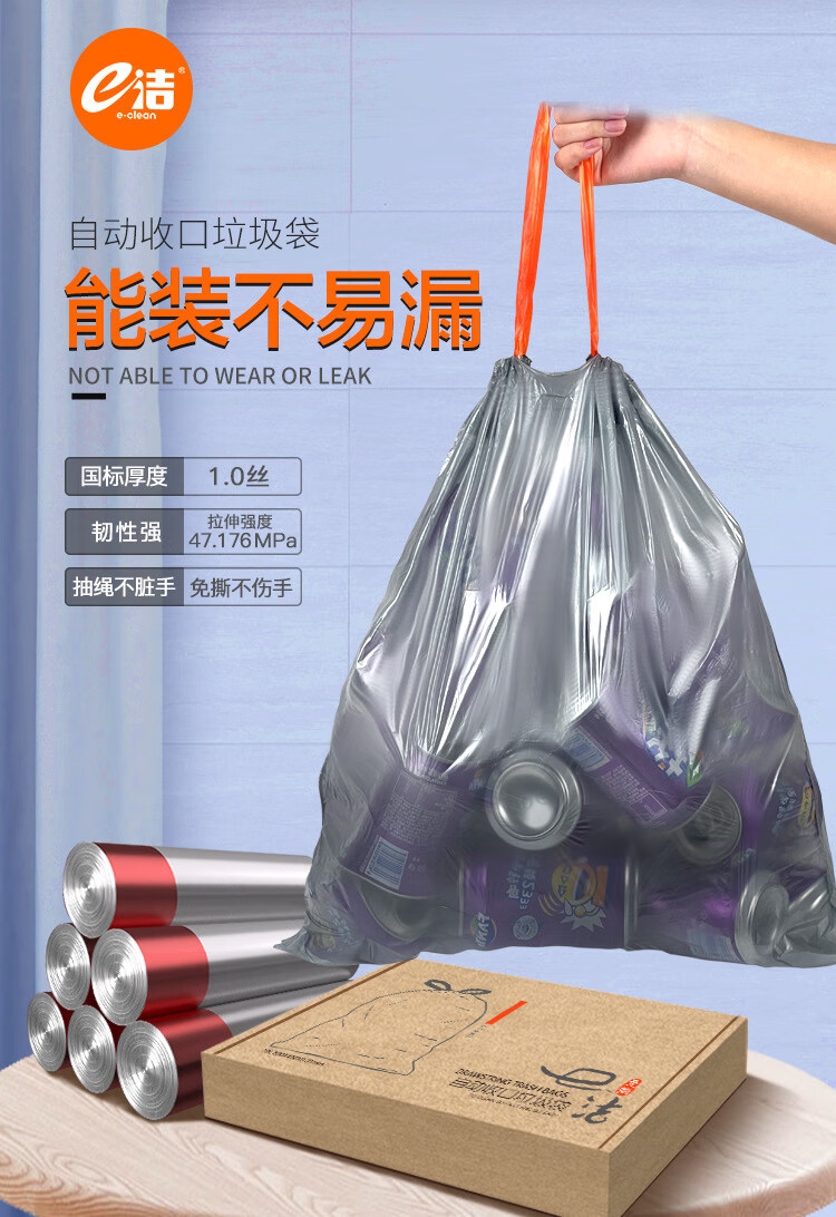 e洁 DT105055-130 抽绳垃圾袋 办公室客厅自动收口大号加厚塑料袋 银色 1丝 50*55cm 130只/盒