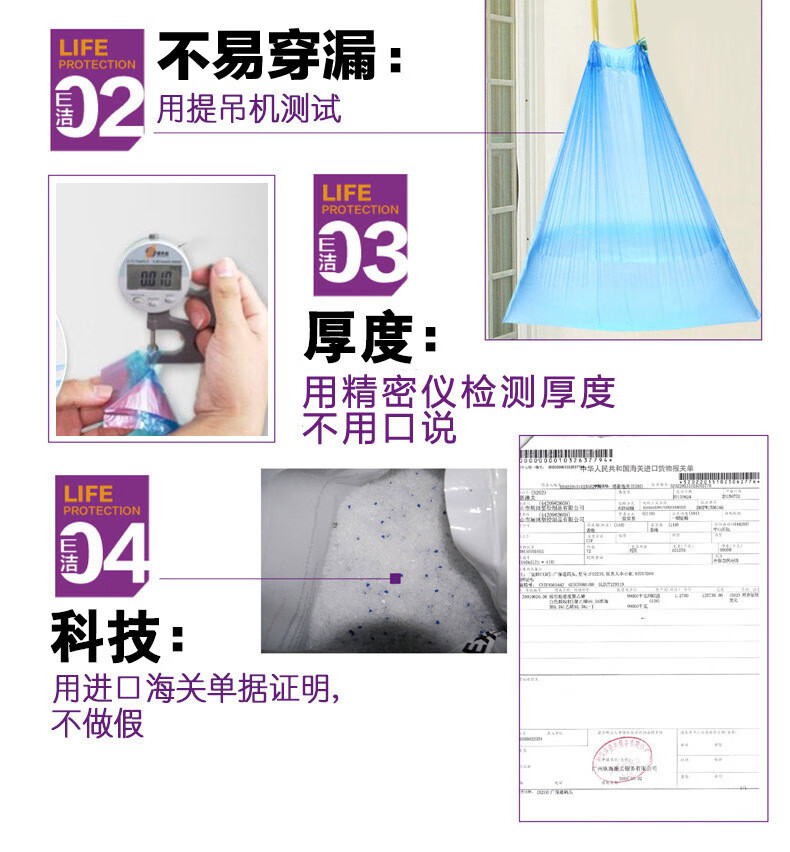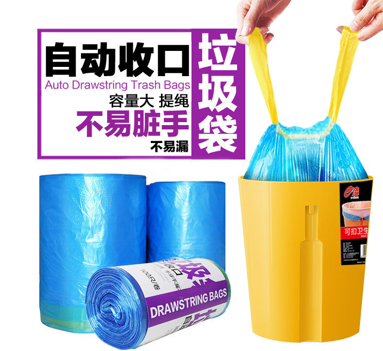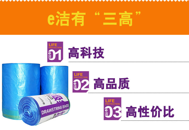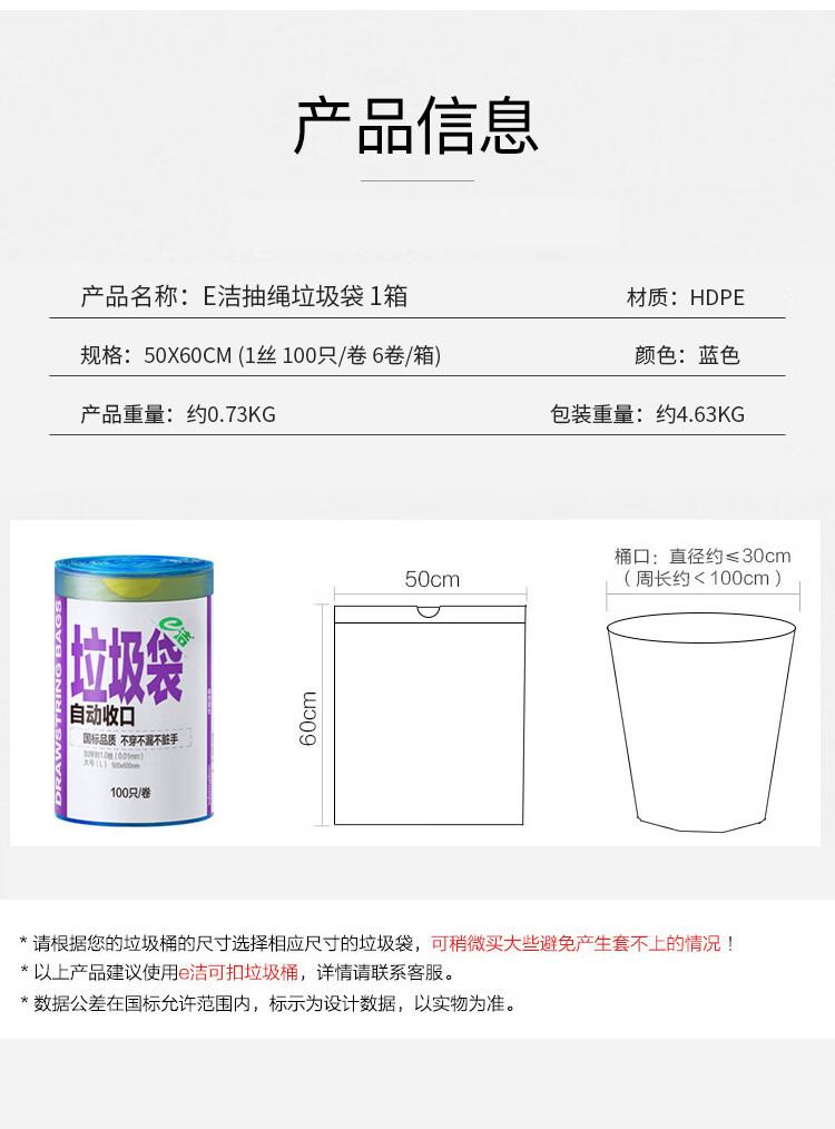 e洁 抽绳垃圾袋 DT105060-100 蓝色 50*60cm 100只/卷*6卷*1箱
