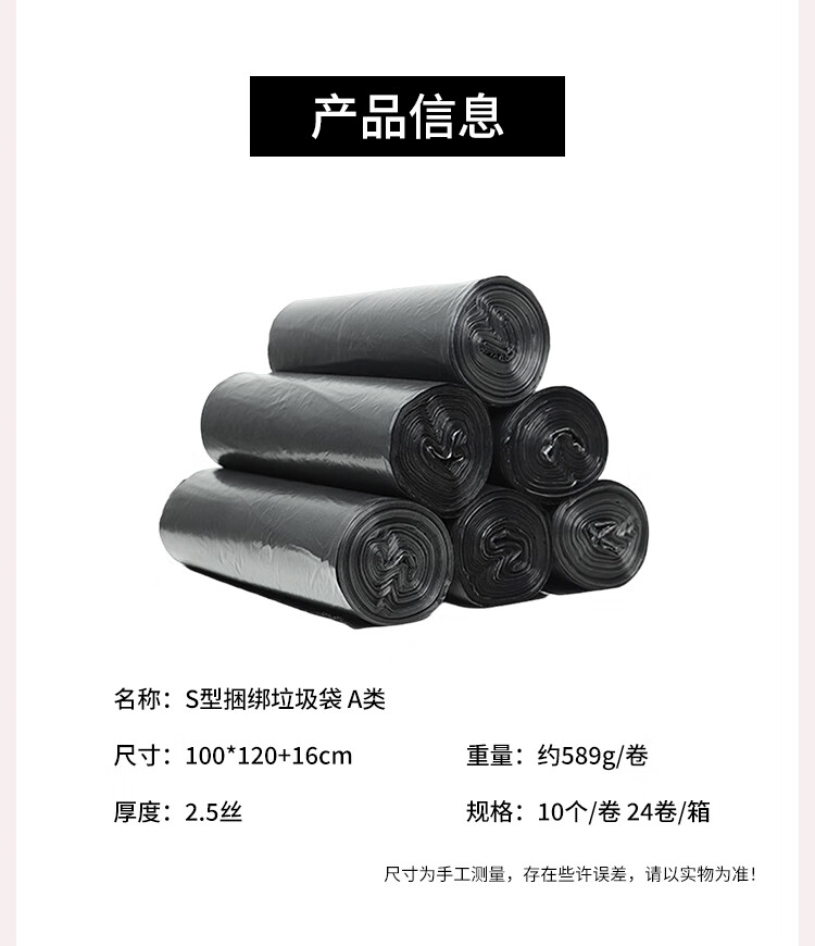 e洁 S型捆绑垃圾袋 UT25100120-10BK-A 黑色 2.5丝 100*120cm 10只/卷*3卷
