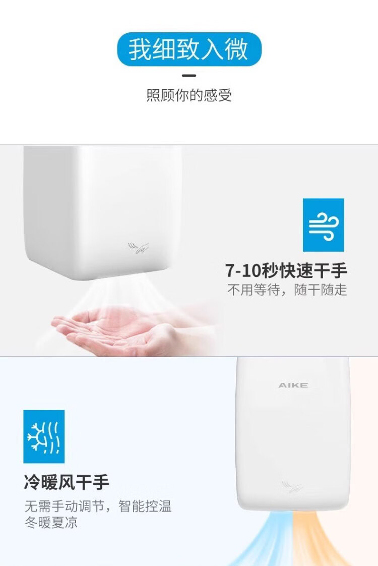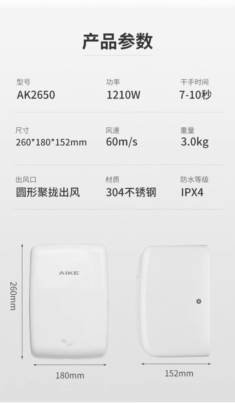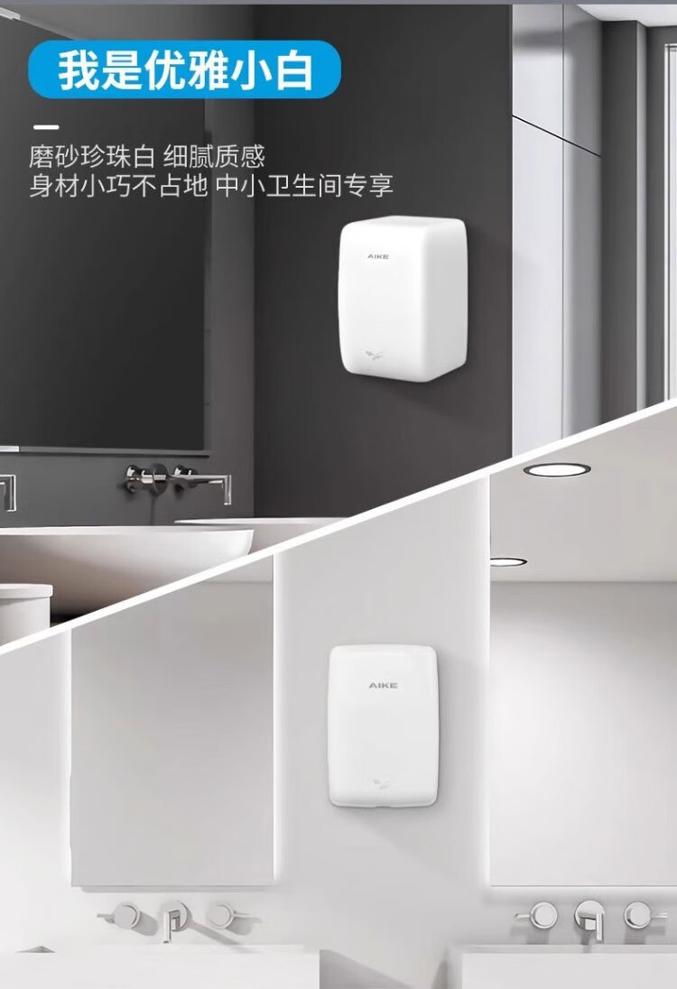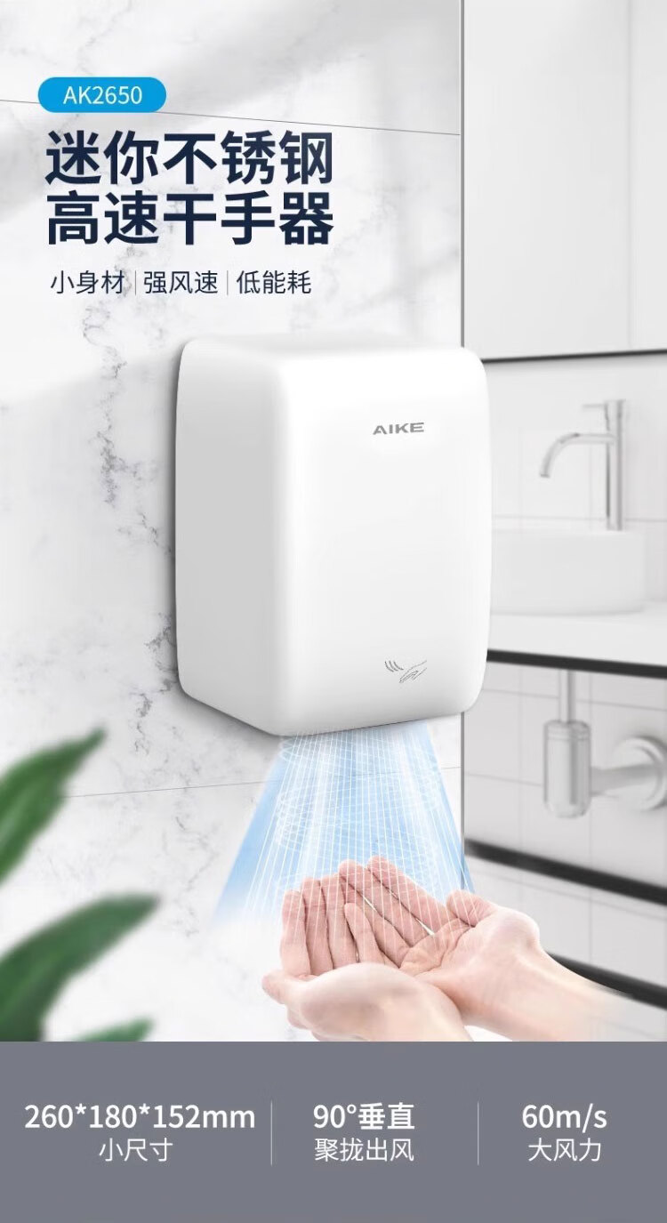艾克(AIKE)AK2650 干手器烘手机 不锈钢防水 卫生间厨房餐厅干手机 全自动感应吹手烘干手机 小型智能冷热风 白色