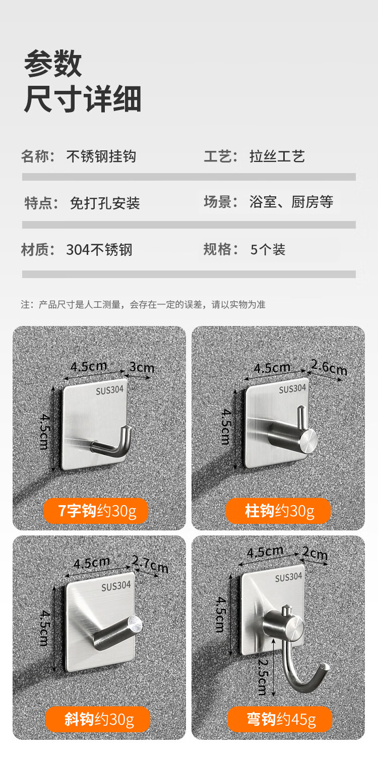 兰诗(LAUTEE) 不锈钢挂钩 7字钩原色2个装 LE932